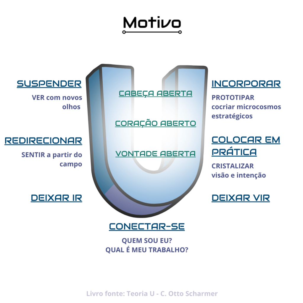 A Teoria U, de C. Otto Scharmer, propõe um caminho transformador para enfrentar os desafios complexos das organizações. Ela nos convida a descer em um mergulho profundo de observação e reconexão, antes de subir novamente para agir de forma consciente e renovada. É uma jornada que passa por suspender julgamentos, redirecionar a atenção, deixar ir o velho, conectar-se com o propósito, permitir que o novo emerja e, finalmente, incorporar mudanças na prática.